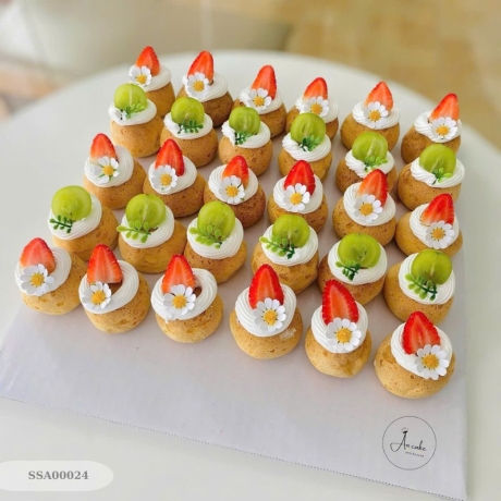 Set 30 bánh su Singapore với lớp vỏ bánh dai dẻo đặc trưng được trang trí cùng trái cây tươi ngon. Bên trong là nhân kem trứng thơm béo